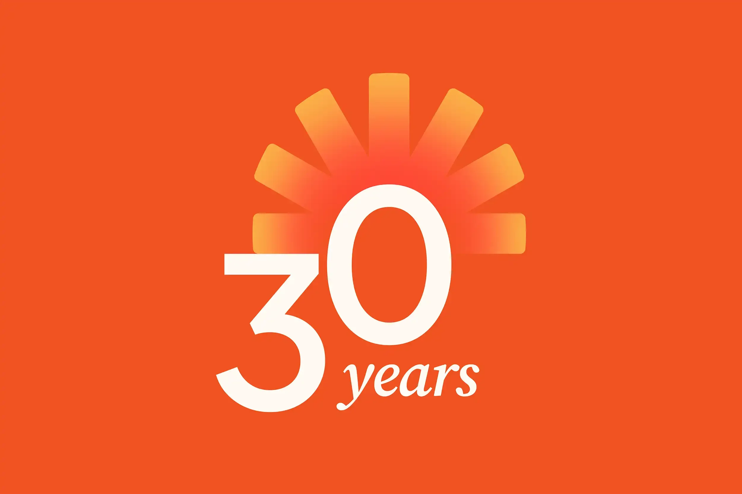 The warm orange gradient running through it all isn't decorative; it's kinetic. It signals momentum, and sets us apart in a sector that tends toward cold blues and safe grays. When we placed "30 years" inside that arc, the icon revealed something it had been holding all along: the rays were always capable of framing something meaningful. The anniversary simply made it visible.