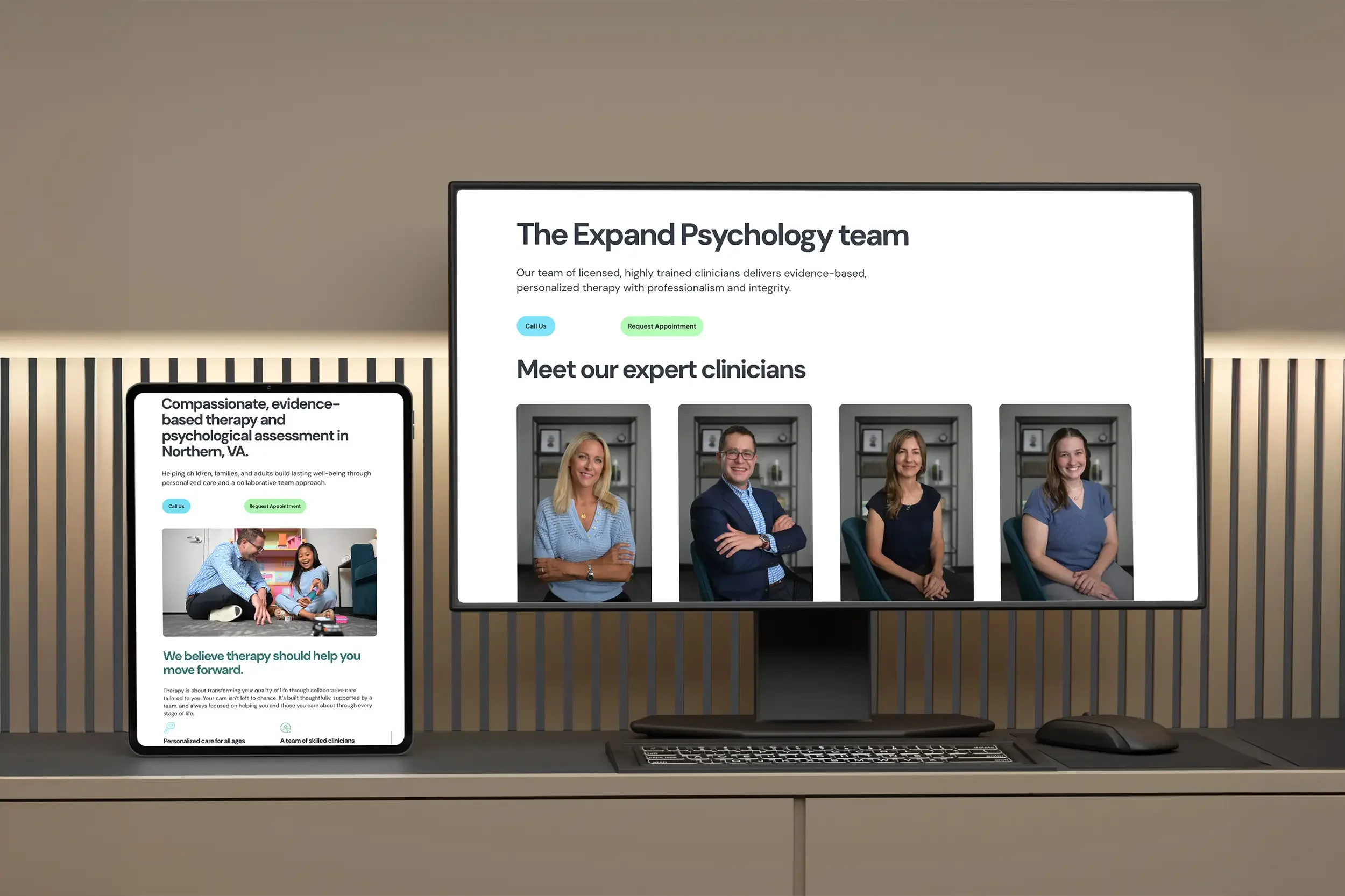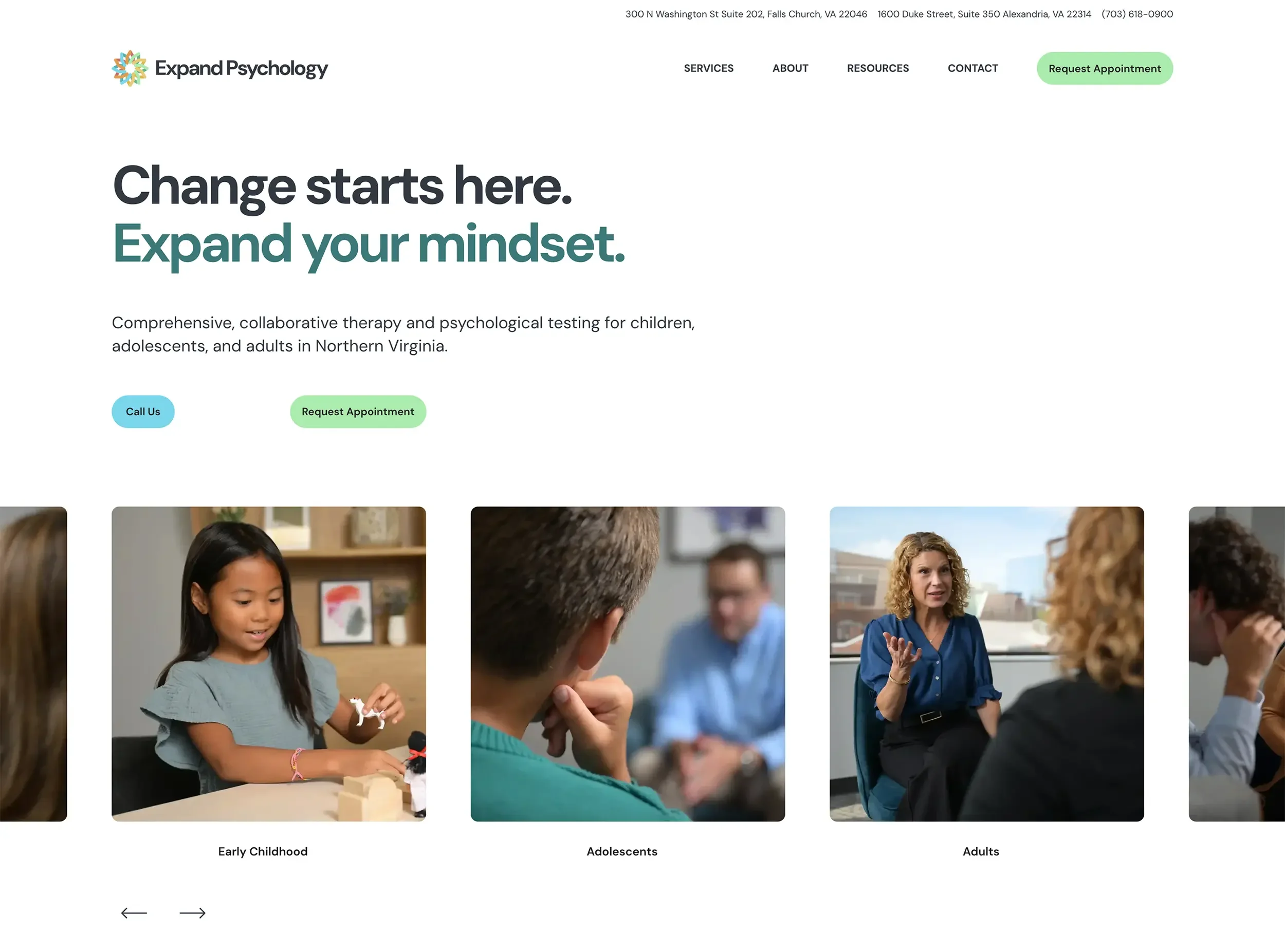 The website serves as both a marketing tool and educational space, positioning Expand Psychology as a trusted, mid-sized, psychologist-led practice in Northern Virginia.